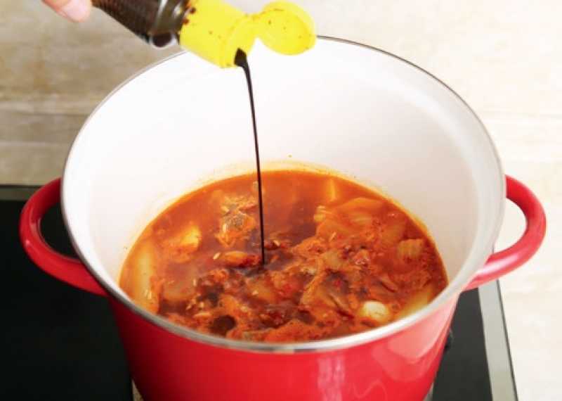 5 將作法4倒入湯鍋中,再加入馬鈴薯、泡菜、韓式辣椒醬、醬油、少許鹽,續煮20分鐘,至馬鈴薯熟軟。