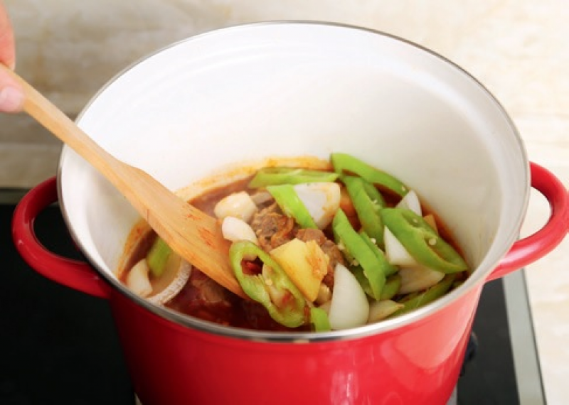 6 放入洋蔥塊、辣椒圈、香油續煮5分鐘,加少許鹽調味即可。