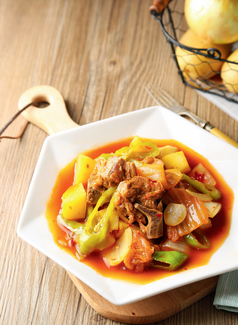 這道菜使用發酵時間長的老泡菜燉煮,濃郁的酸辣味包覆著每一塊脊骨,大口啃骨頭非常過癮。