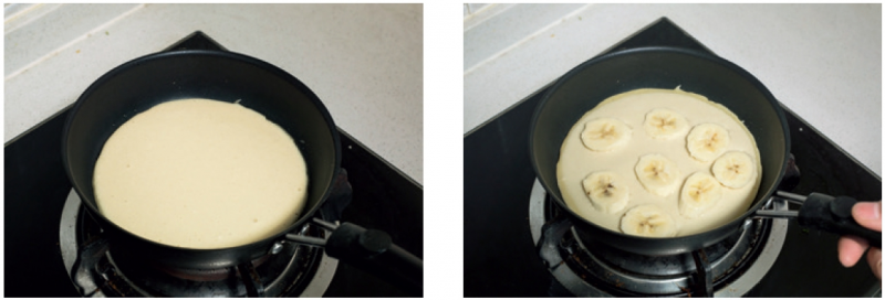 4 煎至麵糊一面凝固、微黃焦香時,放入香蕉片,小火繼續慢煎至成形。
