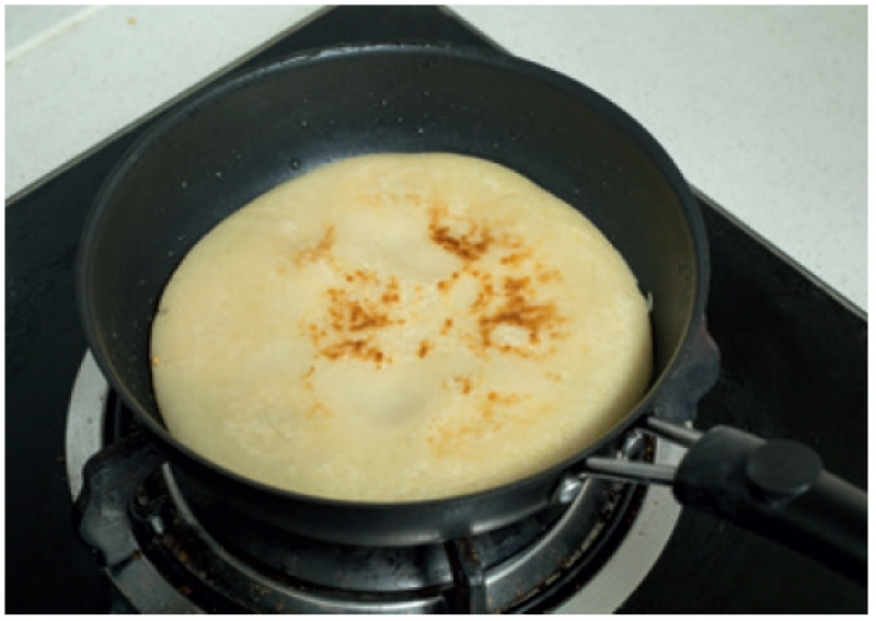 1 在煎麵餅的時候,要等一面完全凝固後再小心翻面,以免麵皮破碎。