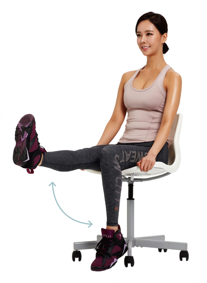 2 將一腿往前伸直,收緊大腿肌肉,將腳腕勾起成直角,舒緩小腿肌肉,並感受大腿的收縮,再慢慢放下腳,回到步驟1的動作,反覆一定次數後,換做另一腿。