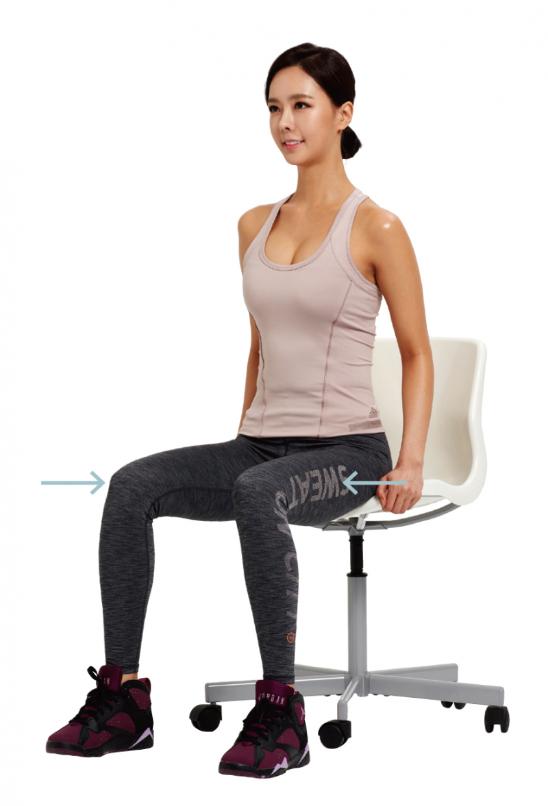 1 坐在椅子上並將背打直,雙腳張開與肩同寬,雙手放在大腿外側
