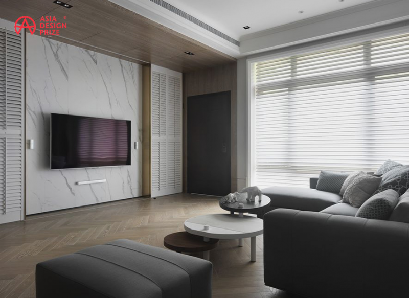 (圖)與百葉簾相呼應的門片後方,收藏著繁雜的電視線材,展現大理石本有的澄淨面容,而金屬色包裹其身,為傳統而平實的印象,描摩精緻現代感。