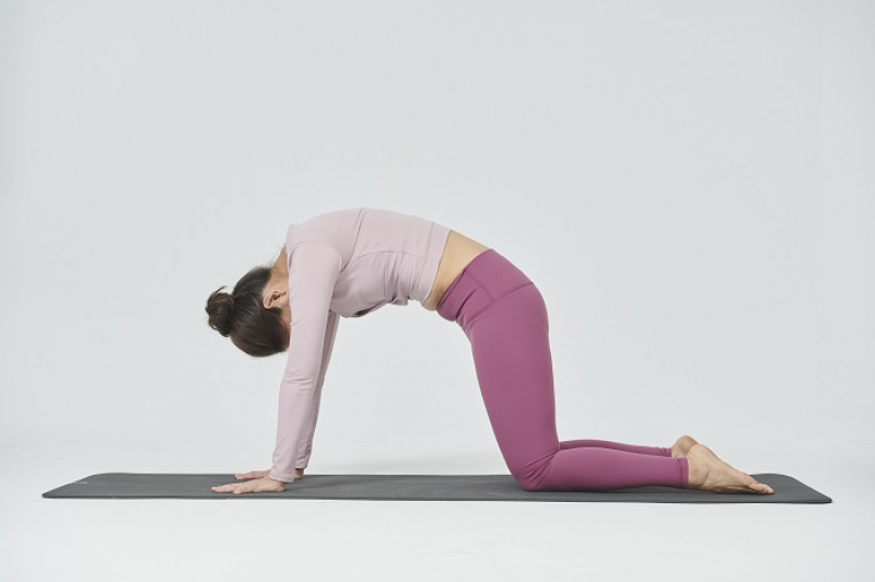 ii. 支撐身體的四個點穩定推地,感覺脊椎前後延伸。吸氣時翹臀挺胸,吐氣時骨盆往前推、背部往上拱,練習5 組,感覺脊椎隨著活動放鬆。