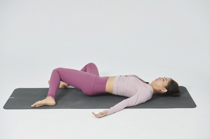 採躺姿。雙腳與瑜伽墊同寬,隨著呼吸,雙膝左右倒,如同雨刷,意識停留在髖關節的活動,練習5 次。