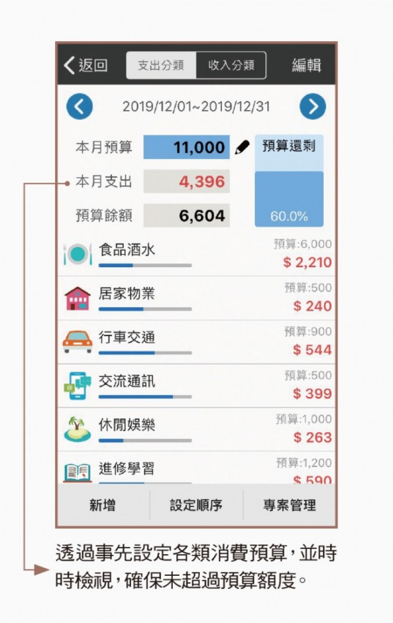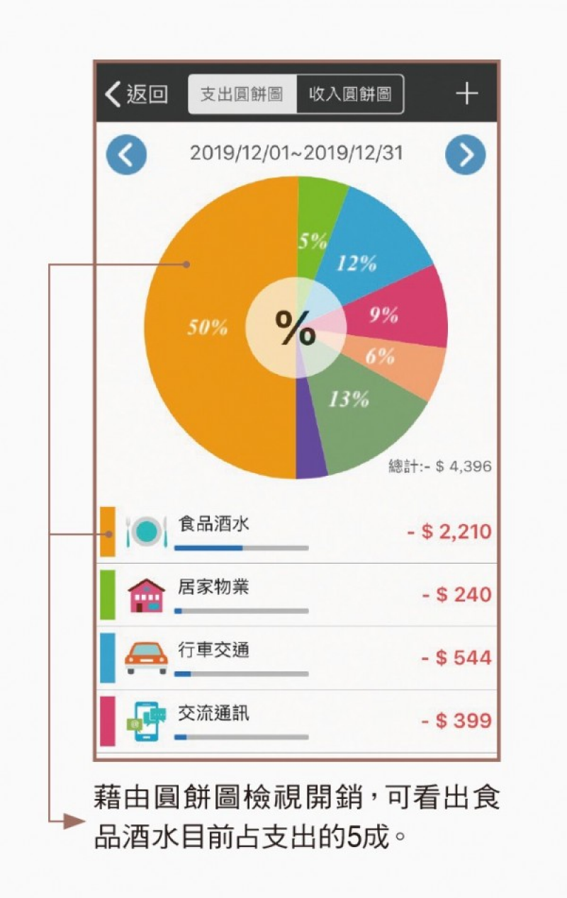 使用記帳 App 的好處是,每月支出會以長條圖、圓餅圖來呈現,同時透過設定各類別消費預算,幫助使用者「抓漏」。使用者不僅可以「看到」財務資源分布狀況,事後回顧,還可進一步思考能否做更有效率的財務運用。