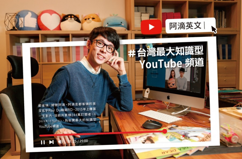 「阿滴英文」是台灣第二個突破 200 萬訂閱的 YouTube 頻道,2015 年成立,5 年來為了打響「阿滴英文」這塊招牌,阿滴做了許多不一樣的嘗試,包括出書、製作周邊商品與內容訂閱等,「YouTube 的演算法與推薦機制不斷在改變,如果沒有做出相對應的轉型,品牌就不會延續。」