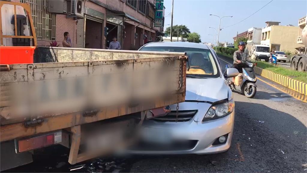 銀色轎車車頭卡在後車斗下方,車燈碎裂、保險桿變形,被撞的貨車差點衝進民宅,停在內側車道的計程車右後方板金也撞到不翼而飛,一起車禍三車遭殃,誰也沒想到,車禍起因竟然是一個保特瓶。