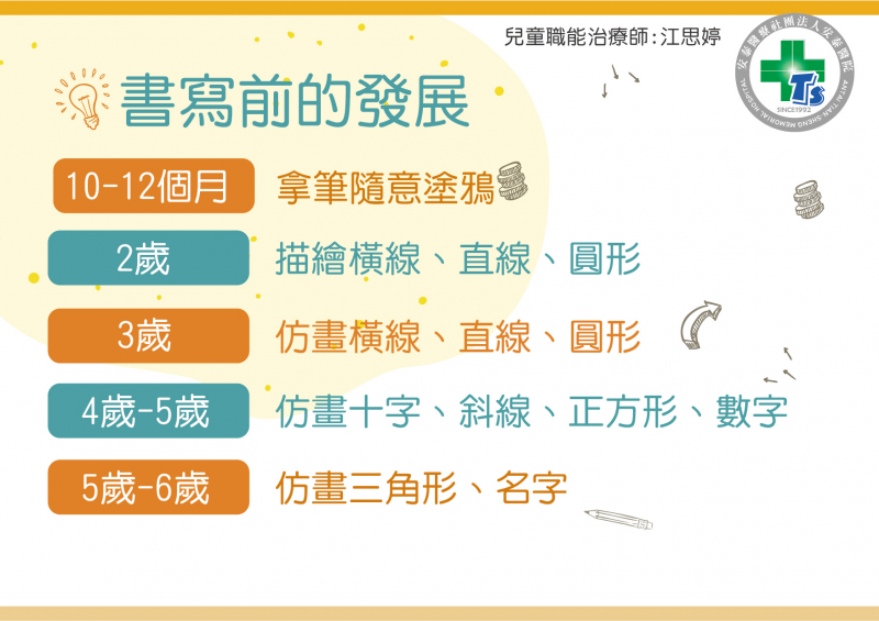 在筆劃的部分的話,小朋友開始練習寫字的時候基本上都會有一個彷畫的發展里程碑,如小朋友可以穩定地畫出直線、橫線、十字型、斜線、正方形、叉叉、三角形等線條,代表小朋友可能在這部分彷畫能力已經具備了。