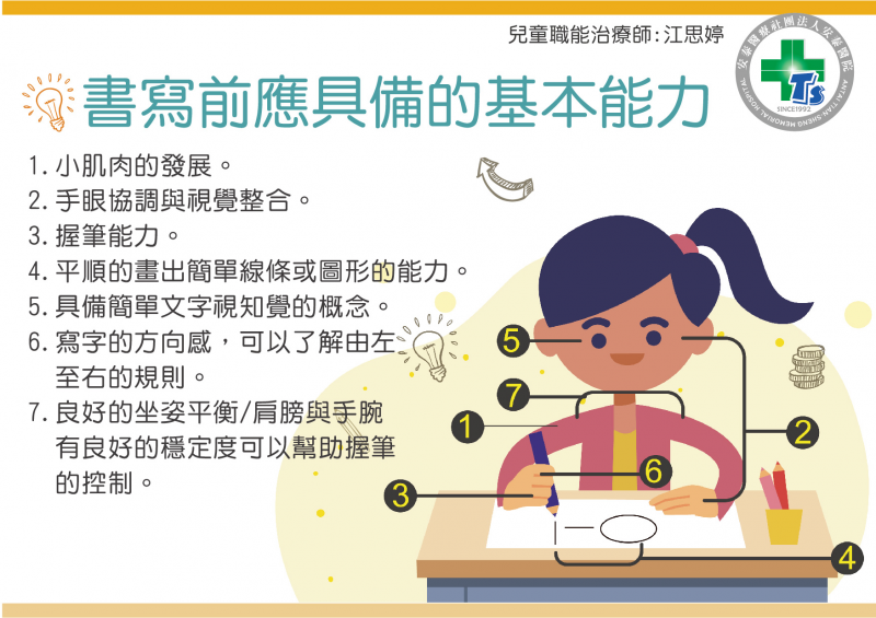 小朋友在書寫能力的發展當中,以抓握的能力來說基本上應要發展出像是拿杯子的柱狀抓握以及拿方形小積木的前三指抓握以及拿鑰匙的側邊抓握等基本能力。