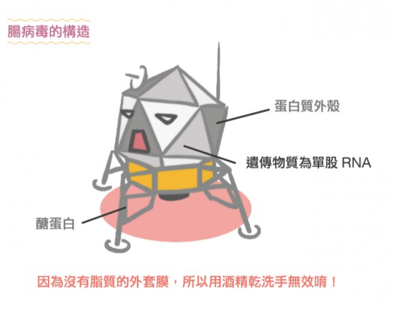 雖然名稱有個「腸」字,但腸病毒比較接近感冒病毒,而不 是腸胃炎病毒,腸病毒有數十型,其中71型和D68型是最近比較常聽到、容易發生重症的型別。得到腸病毒的人大部分是沒有症狀或輕微感冒症狀,所以常常不知道被誰傳染,發病通常是先發燒,接著在口腔、上顎出現水泡、潰瘍,造成進食困難,稱為疱疹性咽峽炎;有些人還會在手掌、腳掌、膝蓋等位置發生紅疹、水泡症狀,稱為手足口病。