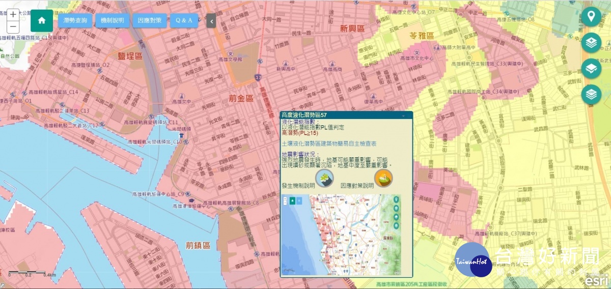 中央地質調查所公告高雄市比例尺2萬5千分之一土壤液化潛勢區後,市府工務局更進一步完成比例尺3千分之一液化潛勢圖的建置,讓市民能透過網路查詢自家住宅或環境是否位於液化潛勢區域,並可提供業者未來規劃與建築的參考。