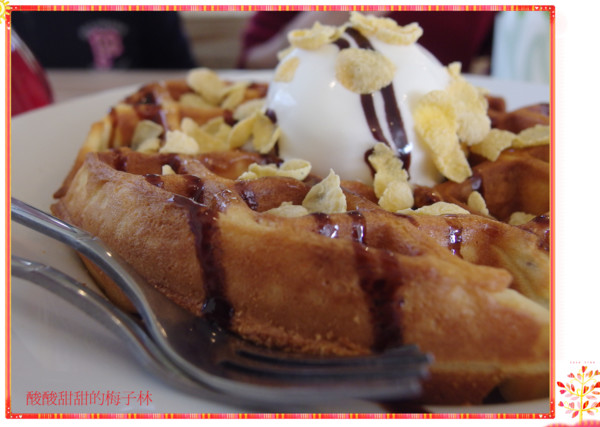 討論完形狀,就來討論鬆餅吧!上面是巧克力醬、冰淇淋跟脆片,因為我們一直在拍照,冰淇淋都化了,所以等到要吃的時候,變成奶昔了……