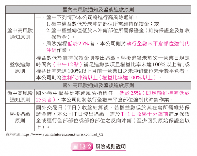 其實只需記住一個重點,目前期交所規定的台指期每口原始保證金是91,000元,維持保證金是70,000元,如果當天盤中權益數(本日帳戶餘額+未沖銷的期貨浮動損益)低於維持保證金,這時候只要在收盤前做兩個動作:「補資金」或者「做部位調整讓權益數回到『維持保證金』之上」,那就安全。如果到收盤之後,行情沒有回頭,你也沒做任何處理,權益數還是沒有回到維持保證金之上,那收盤後就會進入盤後追繳。