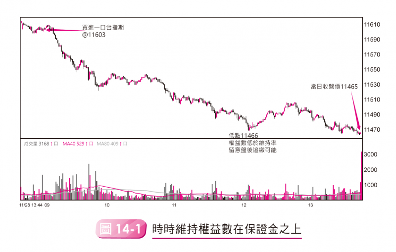 我們用圖14-1的走勢來說明,交易人A的帳戶原本有95,000元,足夠下一口台指期貨(原始保證金91,000),他在早上開盤在11603看多買進一口台期合約,盤中一度跌到11466點,這一口合約損失137點等於27400元,此時權益數為95000-27400=67600,已經低過維持保證金70000的水位,此時你可以選擇補進3000元讓權益數回到維持保證金之上,不然當盤後收到追繳,隔天中午要補進23600元才能回到「原始保證金」的水位,這中間就差了兩萬元的資金。