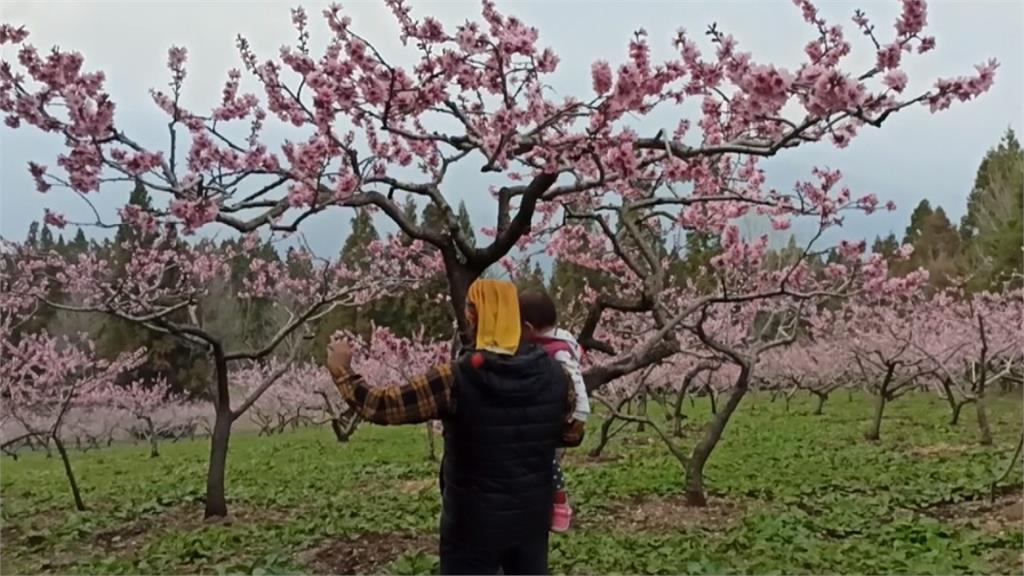 遊客來到農場賞花可以近距離賞花,園區內呈現一片粉紅花海,福壽山農場在「桃園」栽培兩公頃的水蜜桃,約有8到10種不同品種,目前已經盛開大約四成,花期會一直延續到四月底。