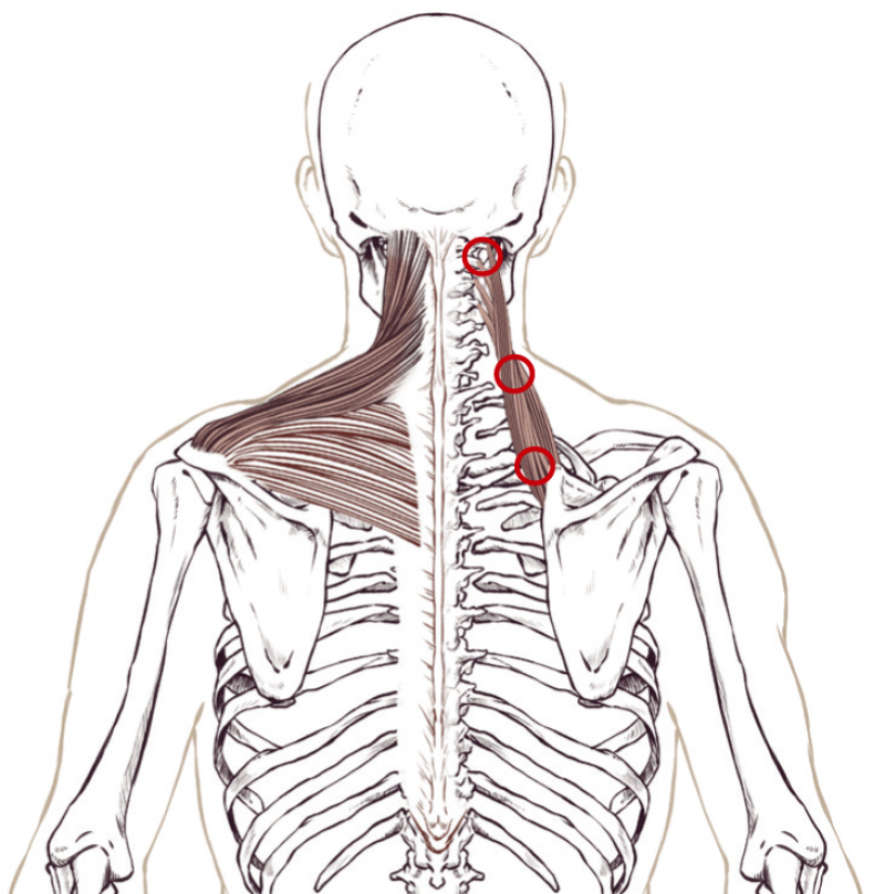 ‧起端:枕外隆凸、項上線、項韌帶、第7頸椎和胸椎1~7椎的棘突
