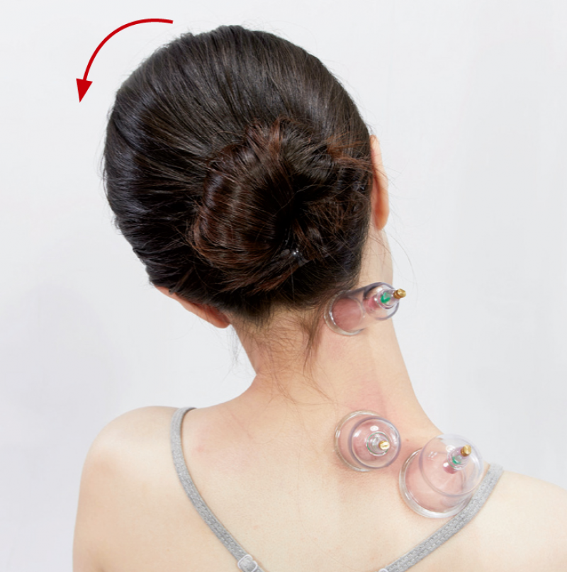 若伸展罐定在右側,被施作者向左(罐子的另一邊)歪頭吸氣,吐氣回正,自主歪頭10~20次。其間若作用罐內的膚色由粉紅轉紅,甚至發紫,即可拔罐。