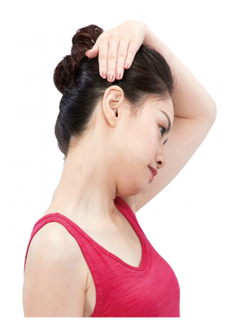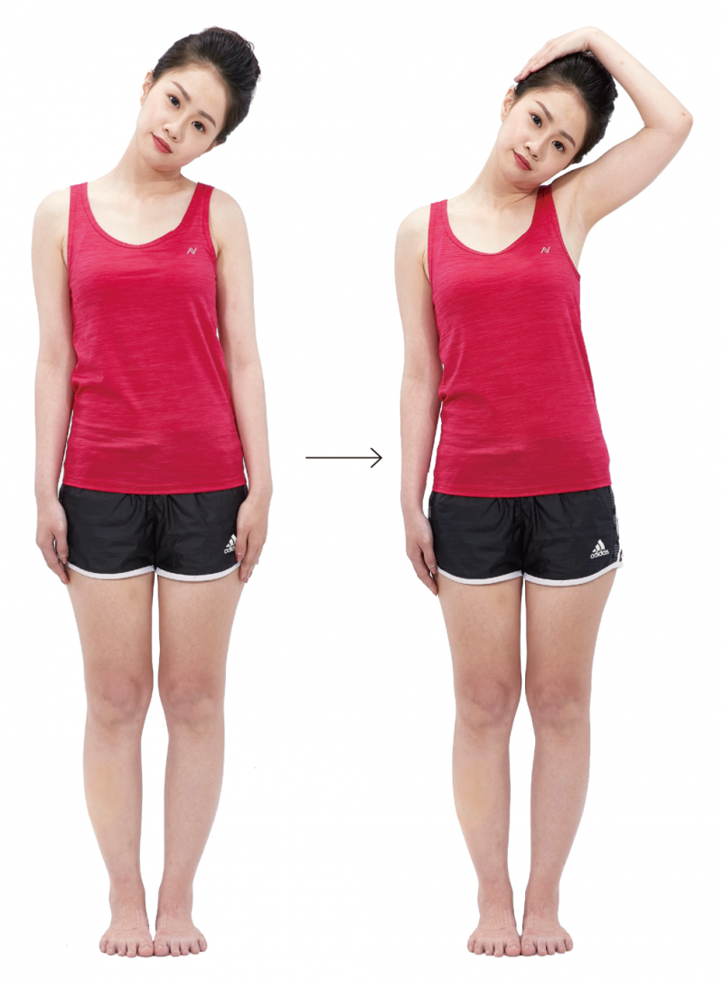 ➊採站姿。向左緩慢地歪頭並吸氣。