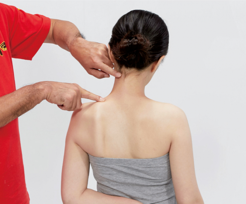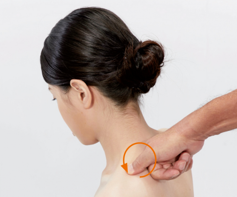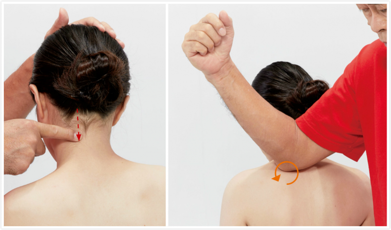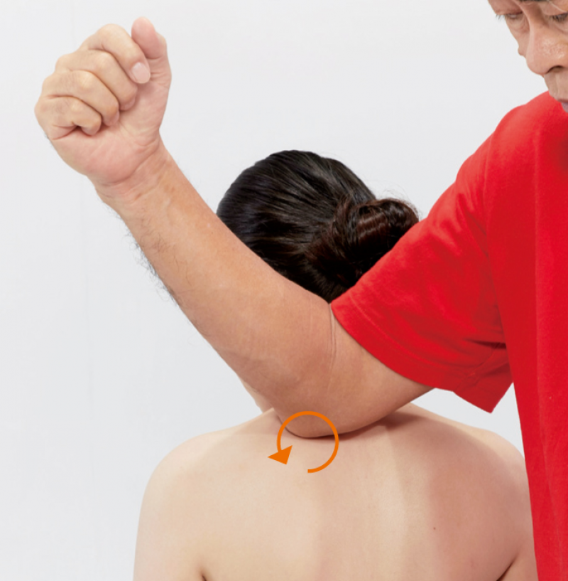 1. 被施作者採坐姿。施作者用手刀以逆時針方向旋揉的方式,由上往下從起端(項上線)慢慢揉至肩胛骨。每個定點壓揉3~6次後,即可移到下個位置。