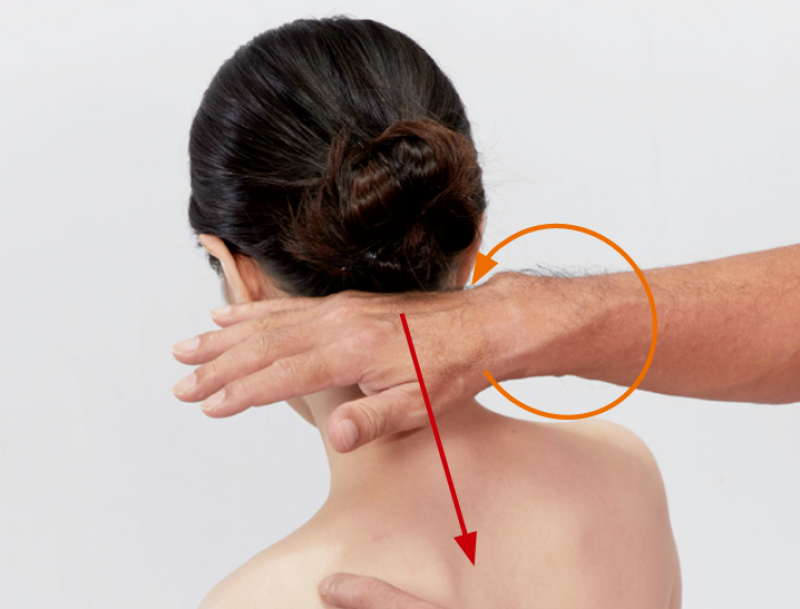 建議:施作步驟2~3後,檢視被施作者的提肩胛肌是否有被放鬆,如果效果不明顯,請繼續重複操作或先用吹風機加熱。
