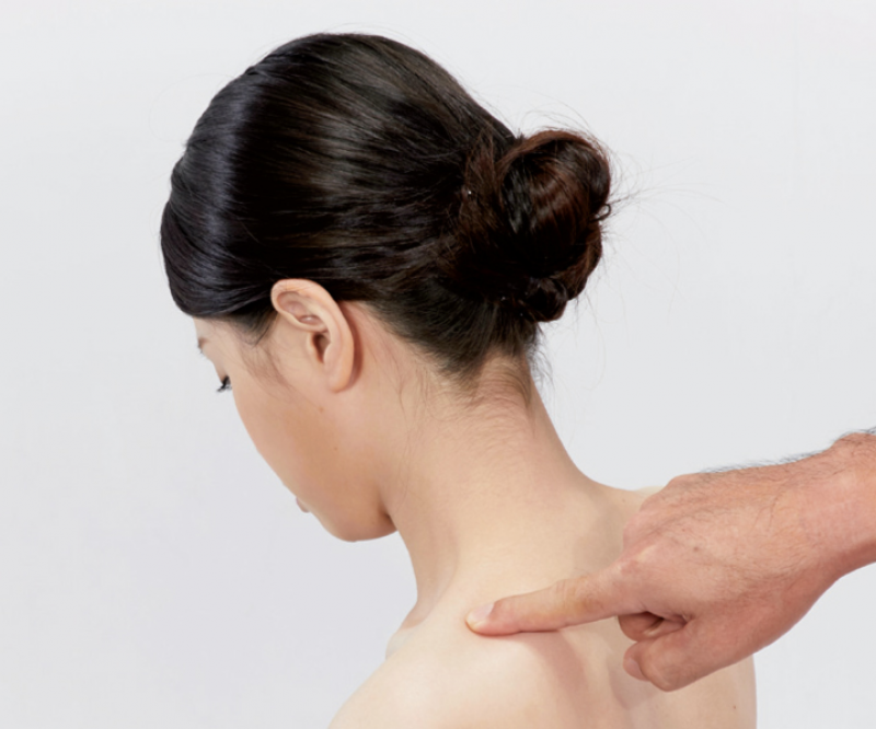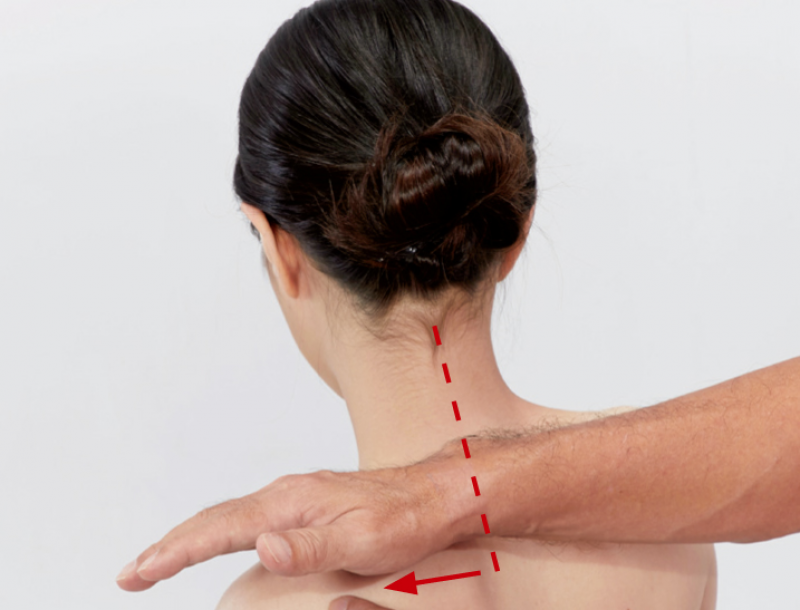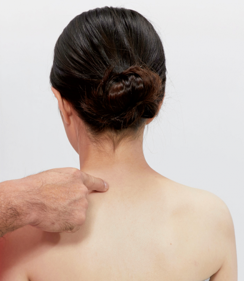 5. 最後放鬆提肩胛肌的轉接點:在頸椎第7椎旁一指幅的位置,這也就是提肩胛肌由片轉成條狀之處。用手肘或指腹針對痠痛點先輕輕按壓3~6次。