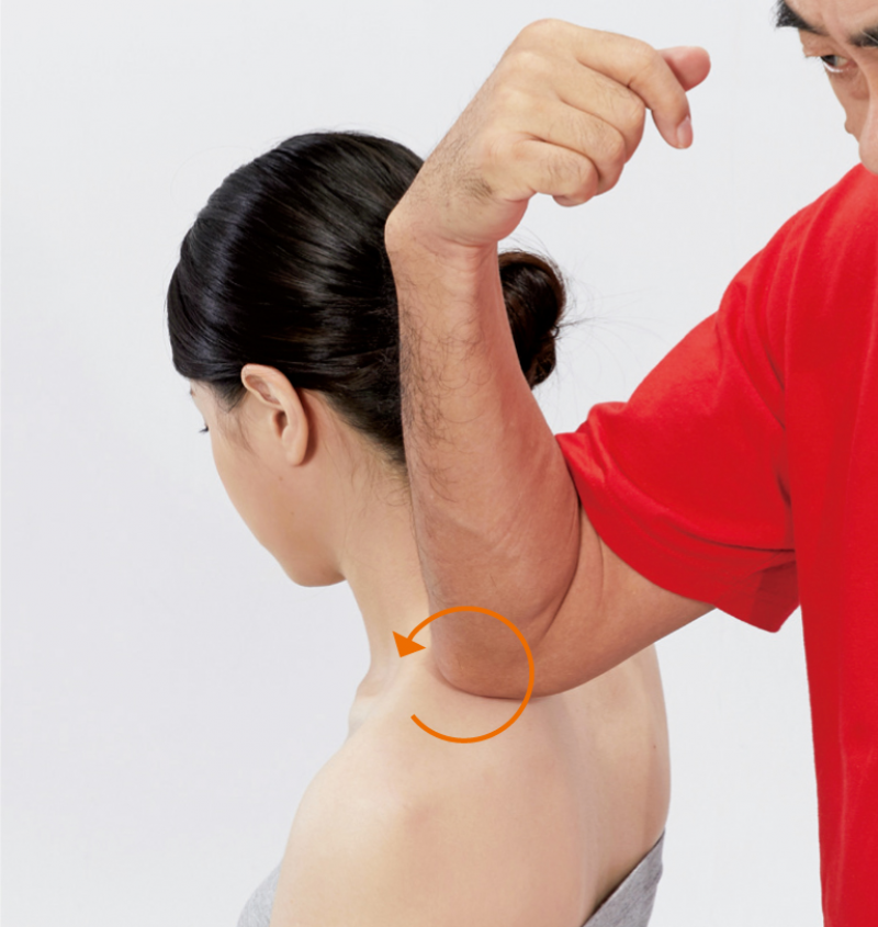 1. 被施作者採坐姿,將手往後折。施作者找到肩胛骨內緣(肩胛崗以上)之後,被施作者的手便可放下。施作者用指腹觸找提肩胛肌的起止端。
