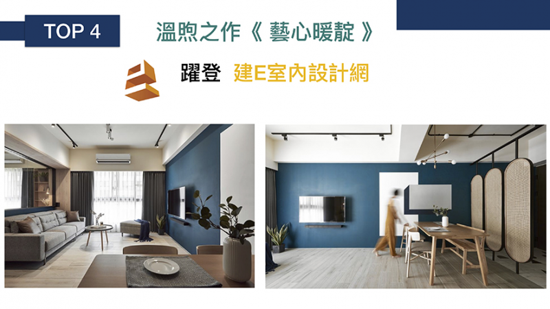 本案在主牆設計上,以靛藍色主牆寄寓遠海意象,將透亮家宅的氣流採光吹送至各角落,並以矩形為基礎,發展出異材質共構的藝術色塊,框構出輕盈無壓的理想所在,如此優美佳作也擄獲「建E室內設計網」芳心予以刊載。