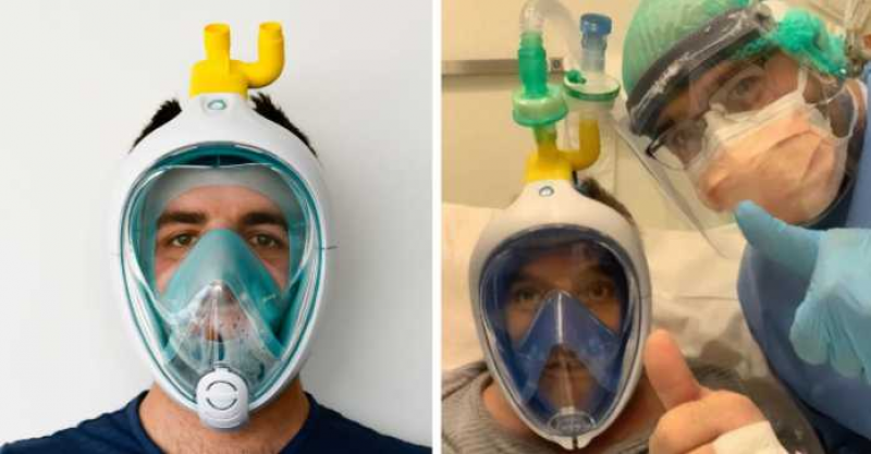 這個來自義大利的工程公司,接到了義大利一位醫生的請求和想法,來應付目前病人沒有呼吸面罩的困境。這位醫生,Renato Favero想到說既然面罩短缺,生產數也跟不上,為何不把現有的潛水用面罩改造成可以連接在呼吸器上面的面罩,用在非重症患者身上呢?