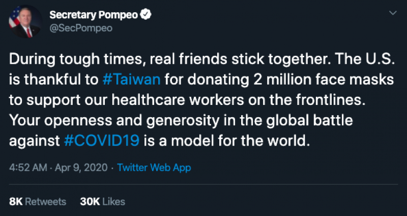 美國國務卿Pompeo在2020年4月9日,在推特發文,感謝台灣的慷慨捐贈!