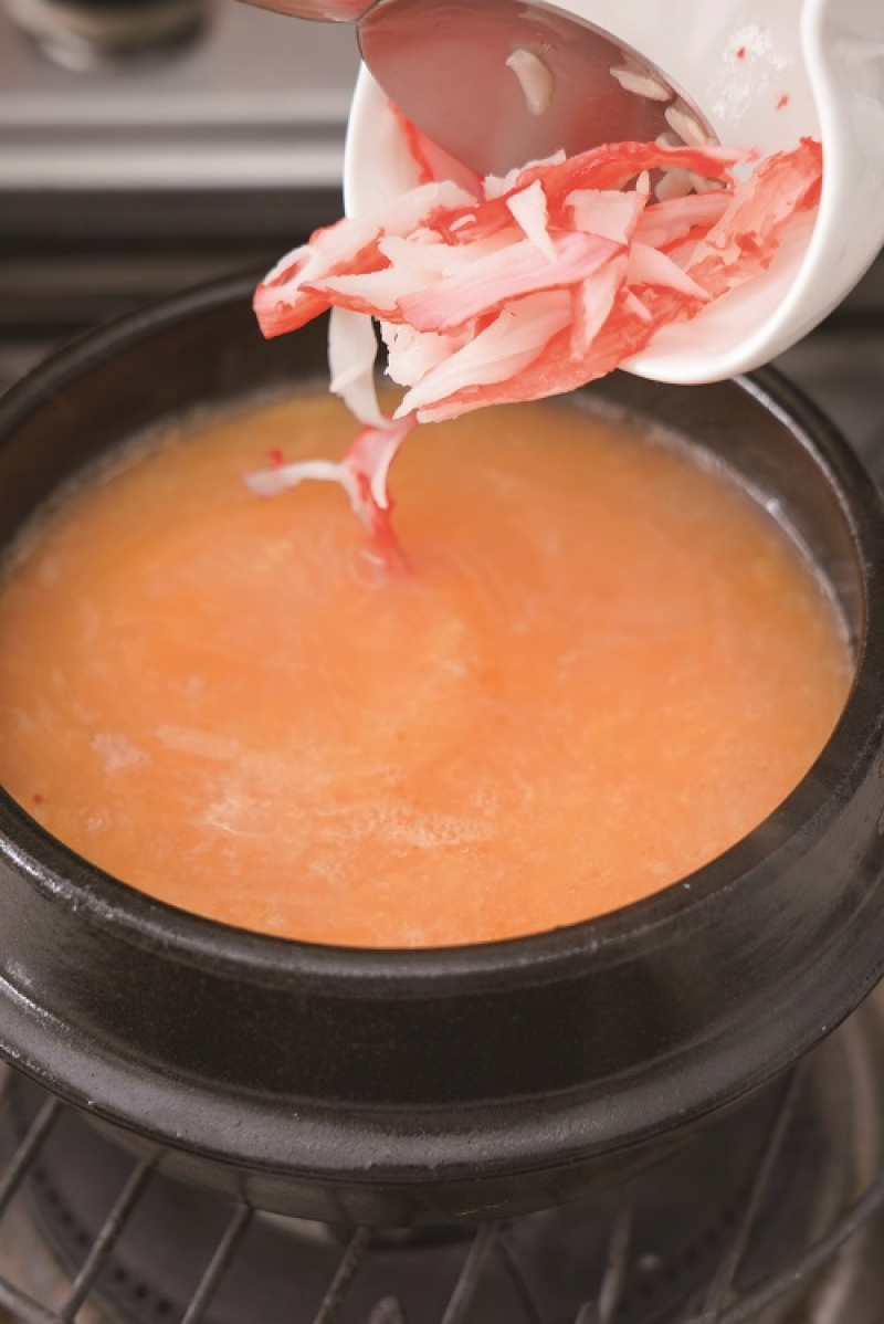 2. 接著放入蟹肉棒、起司絲,煮開到9分熟時關火。