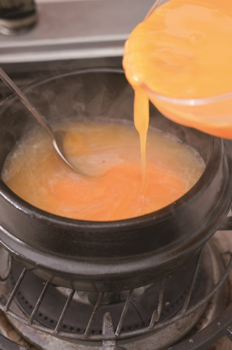 1. 將昆布放入鍋中煮20分鐘。再倒入已經抹上香油的陶鍋,加入調味料煮滾後,再倒入打好的蛋汁。