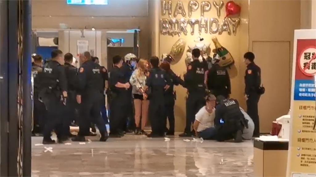 4名員警抓著一名男子的四肢將他帶上警車,這名男子狼狽的模樣,完全看不到衝突當下的狠勁,警方訊後將六名鬧事男女依社會秩序維護法送辦。