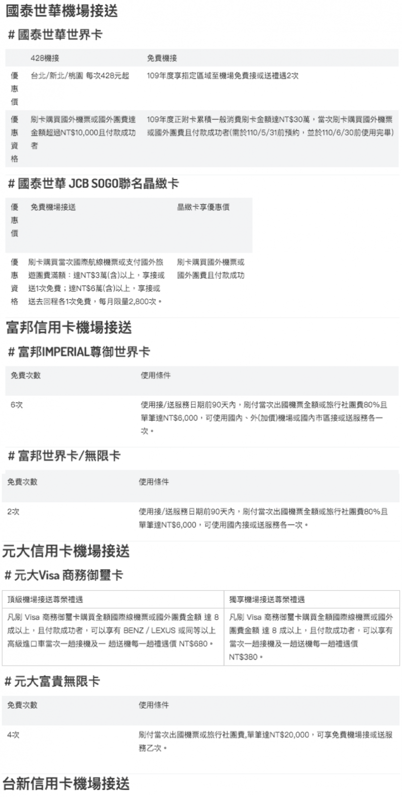 原文連結:2020信用卡機場接送推薦|中國信託、國泰世華、富邦、元大、台新信用卡機場接送總整理