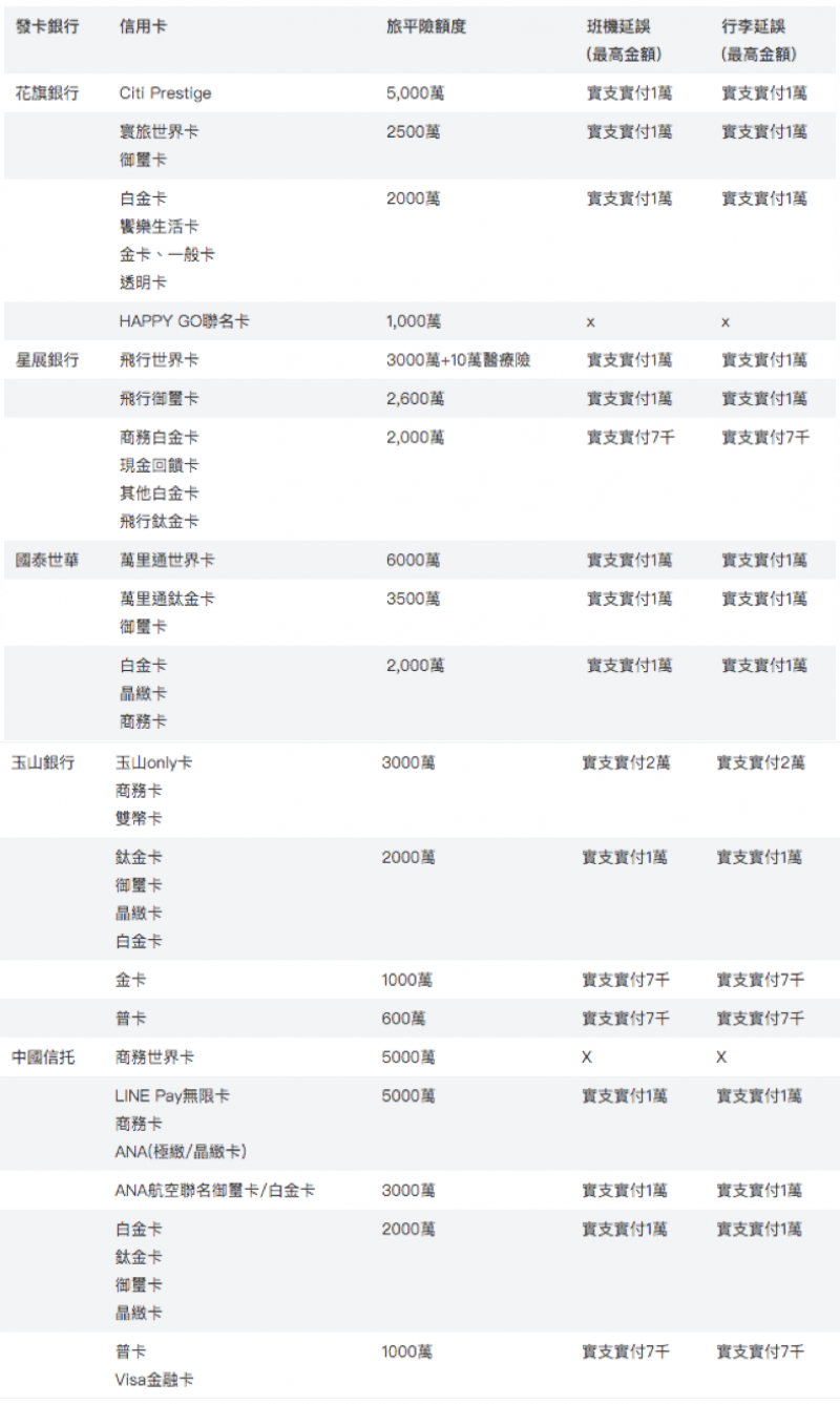 如果你也是經常旅遊的人,一定也會特別留意旅平險、不便險等旅遊保險,好讓旅途多一點保障!出國旅遊大部分都是以刷卡購買機票或團費,只要達到一定的消費門檻,信用卡公司都會有都有贈送旅遊平安險,如國泰信用卡、花旗信用卡或玉山信用卡等,信用卡旅平險跟一般的產險旅平險有什麼不同?本文整理的各家信用卡旅平險比較表,供大家出國參考!