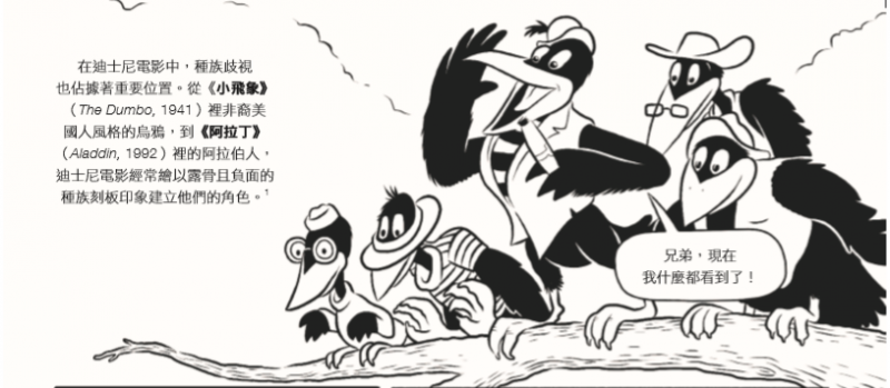 本畫格中的烏鴉,其中一個名字就真的叫作「吉姆‧克勞」(Jim Crow,crow 即烏鴉之意),在種族隔離時期的美國,這是一個被廣泛認為是代表黑人的種族主義詞語,將黑人與白人隔離開來的法案就以這個名字命名(譯註:即吉姆‧克勞法〔Jim Crow laws〕,也稱黑人法,是 1876 年至 1965 年期間,美國南部各州以及邊境各州對有色人種〔主要針對非洲裔美國人,但也包含其他族群〕實行種族隔離制度的法律)。
