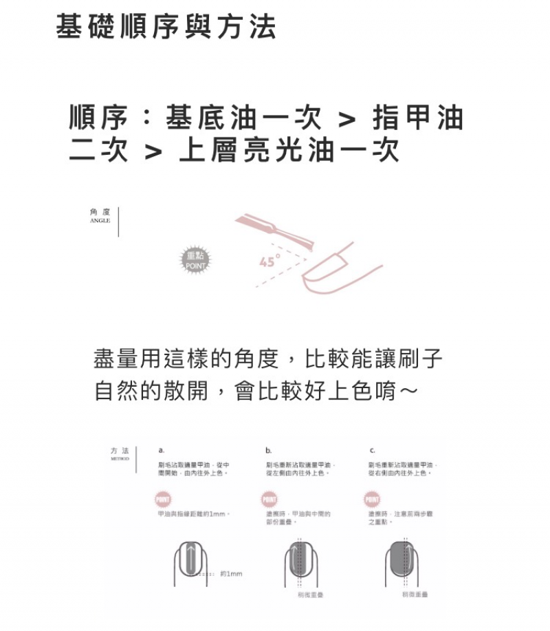 首先塗指甲油前,先確認甲面沒有油脂殘留(可用去光水先清潔),再來以基底油讓甲面平滑一些,上色以兩次為佳,第一次以覆蓋甲色、再次撫平為目的,所以薄塗即可!待乾後,再上一層上層油,就完成啦!最重要的是指甲油是需要練習手感的,所以肯定會越塗越好~趕快用這個藉口入手指甲油吧(什麼啦!)