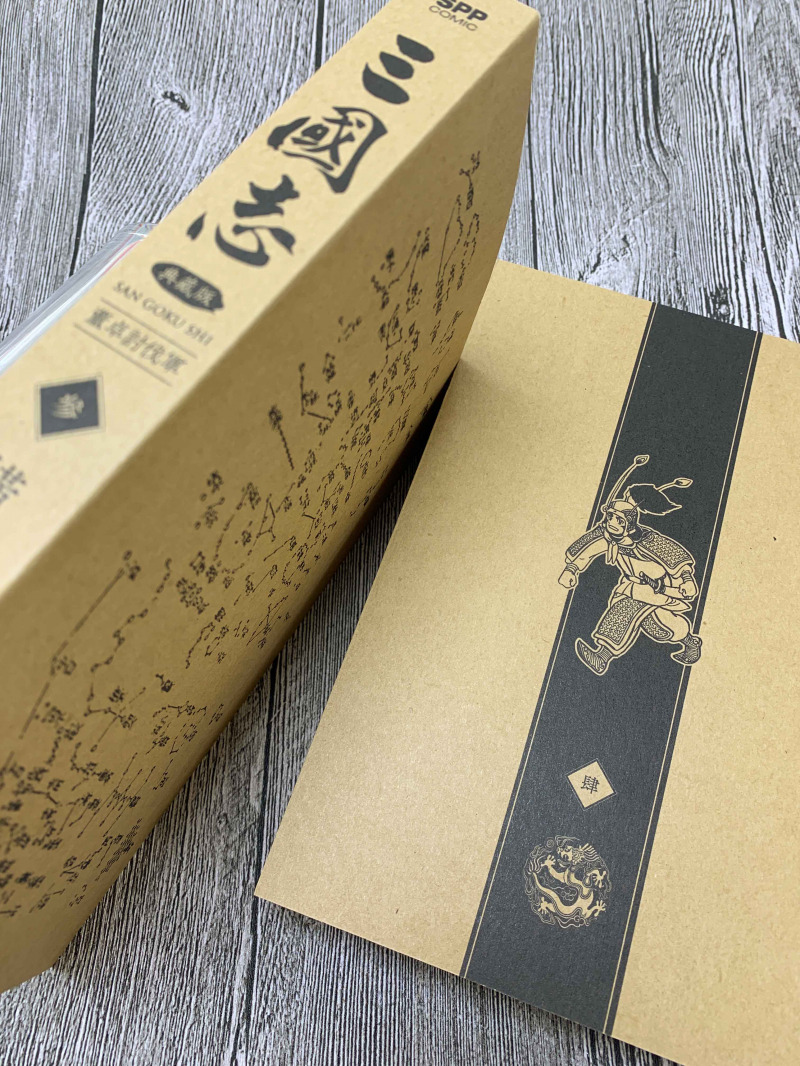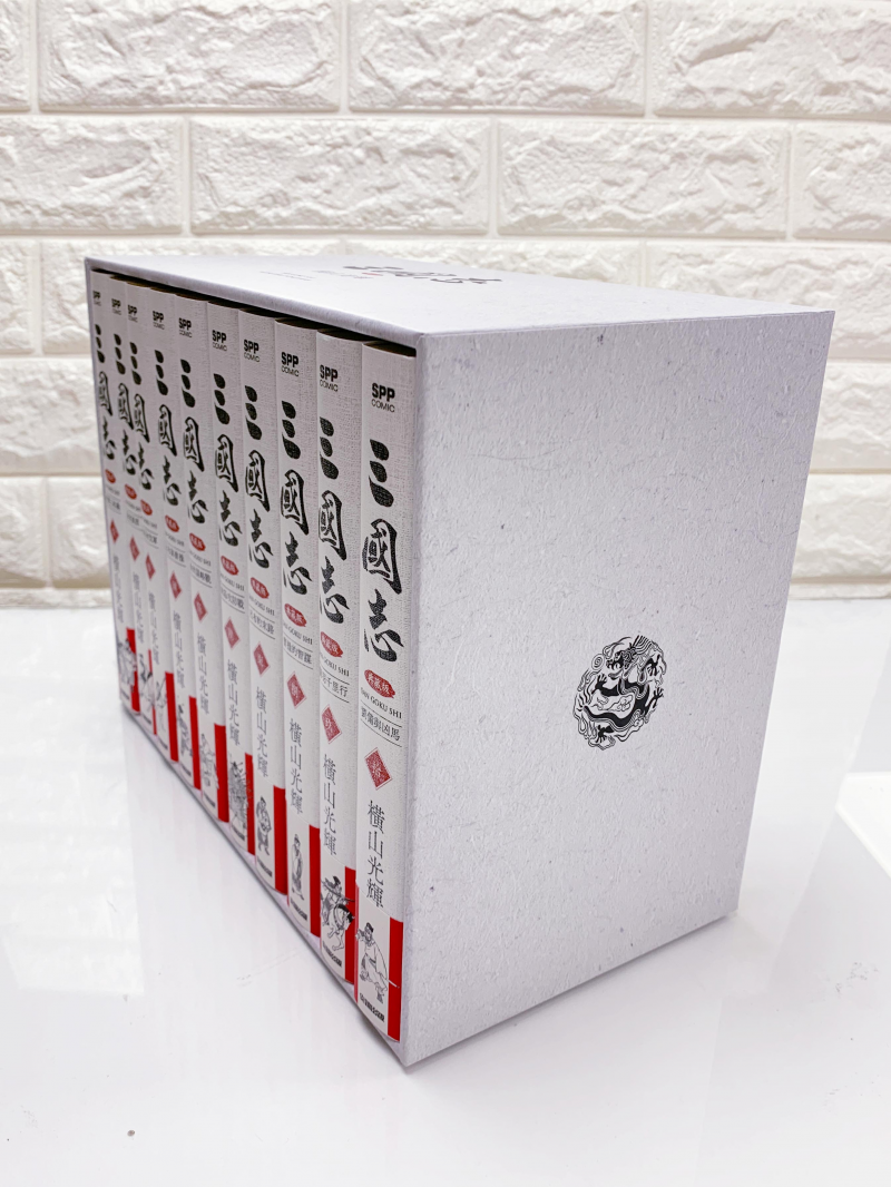 《三國志典藏版》分三次出版,每次共10冊,第一批出版的劇情描述至水鏡先生登場,指點劉備去問賢於臥龍、鳳雛。本次中文版同步推出盒裝典藏套書,內含10集單行本與精美收藏書盒。典藏版比照日本《三国志愛蔵版》每本都有彩頁收錄,封面採用高級畫布紙,不僅紋路典雅且增加一層防水、防灰塵的多麗膜,方便讀者收藏傳世;收藏書盒延續封面的雪白古典,反面印有劉關張的馬上英姿,收藏度滿點。