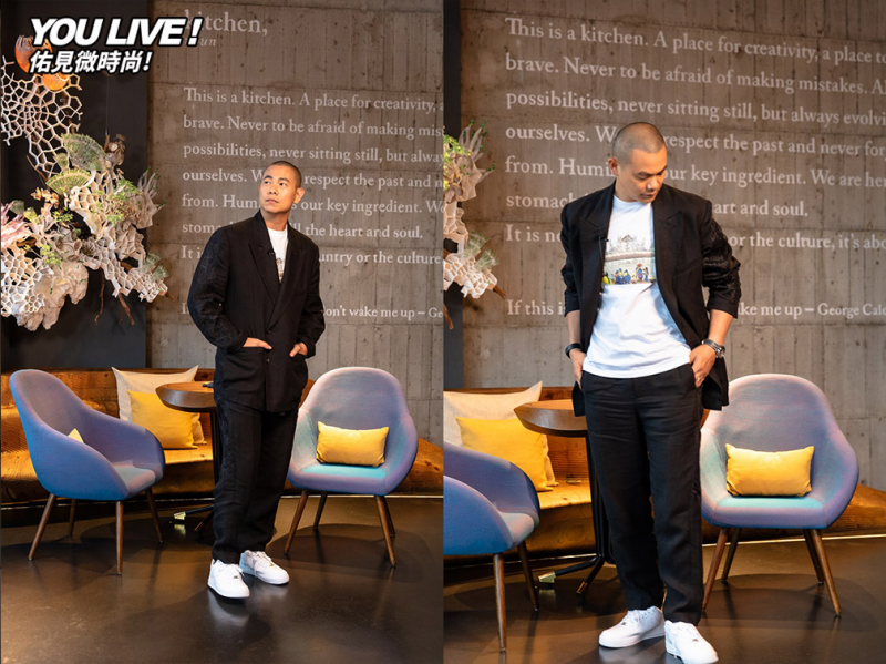 李佑群老師知道要幫名廚搭配造型時,特別選擇符合大廚氣場的LVMH 2018青年設計師冠軍的西裝外套,但是為了讓西裝外套不過於嚴肅,還加入了義大利MSGM聯名辛普森家族的卡通T。沒想到曾為時尚名模的江振誠,一穿上整套搭配,氣場爆棚。彷彿時尚名模重新復出,讓休閒風味的卡通T也瞬間高大上了起來。讓江振誠直說非常喜歡這次的搭配。