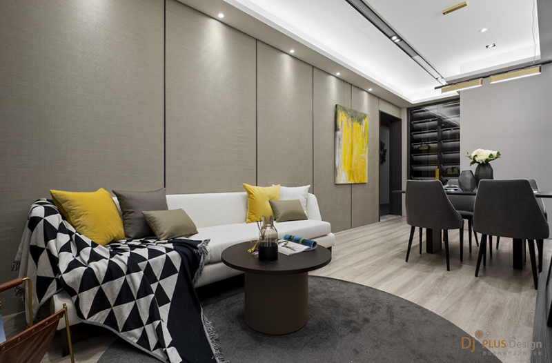 樣品屋作品《現代時尚》裡,可見利用石、鐵與木等材質的碰撞,打造低調內斂且優雅清新的風格場域,予以探訪者舒適宜人的五感體驗。其中公領域中以時尚簡約的灰白黑色調為主軸,切分場域的紋理壁磚映照天花鐵件嵌燈的反射,異材質的搭接使得場域熠熠生輝,而柔軟的米白布製沙發,在跳躍的輕盈黃抱枕打底下,帶來愉悅柔和的感受,兩者間共同營造出充滿性格的質感家居。