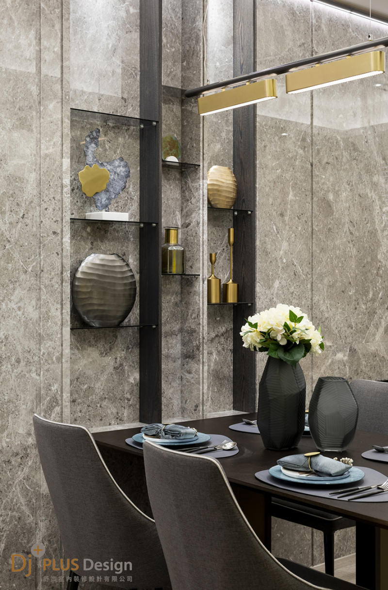 (圖)在一成不變的石牆上嵌出數個層架,並強調結合性的功能,讓橫排嵌燈照著一家人的團聚膳食,擺設幾件藝術飾品,呈現雅緻的空間美學。
