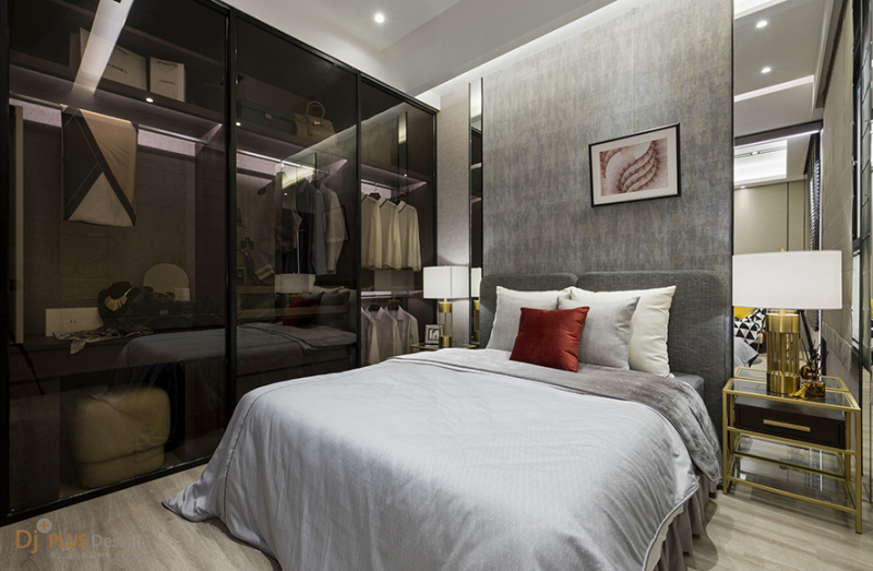主臥設計上延續灰白黑主調,挑高的天花延伸至斑駁灰的主牆,搭配深灰床頭,使整體達一致性的視覺效果。茶色清玻的衣櫃則跳脫場域氛圍,展現通透立面明朗的室內氣息。
