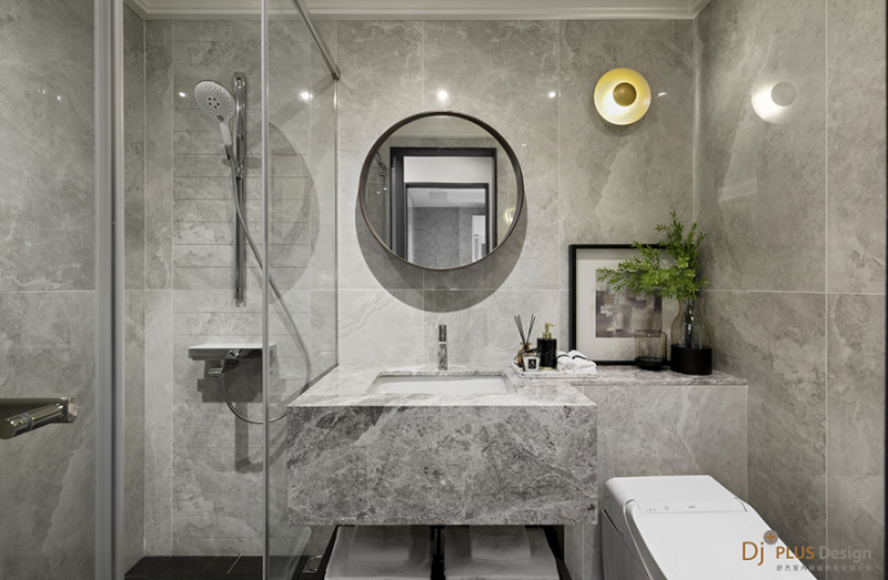 浴室牆面採用質感大理石拼鋪,讓空間備感沁涼舒適,而洗手台的沈穩灰則顯現出,設計師想與予以褪去一身煩惱的場域情境,一種簡約高尚的氛圍流露,並以金屬寬圓鏡作為點綴,一股自然的靜謐感流瀉而出。