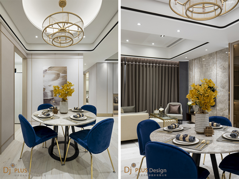 走進餐廳,可見與公領域截然不同的風格呈現,搶眼的鈷藍色絨布椅,感受西方獨樹一幟的風格代表,而天花圓形嵌燈襯托下的簡約吊燈,除了寓意東方圓滿、圓融的精神傳承之外,更碰撞出和諧靈動的美感。牆上的金屬線段與天花的經典黑框,圍塑天地表情,也讓心境隨之轉換。