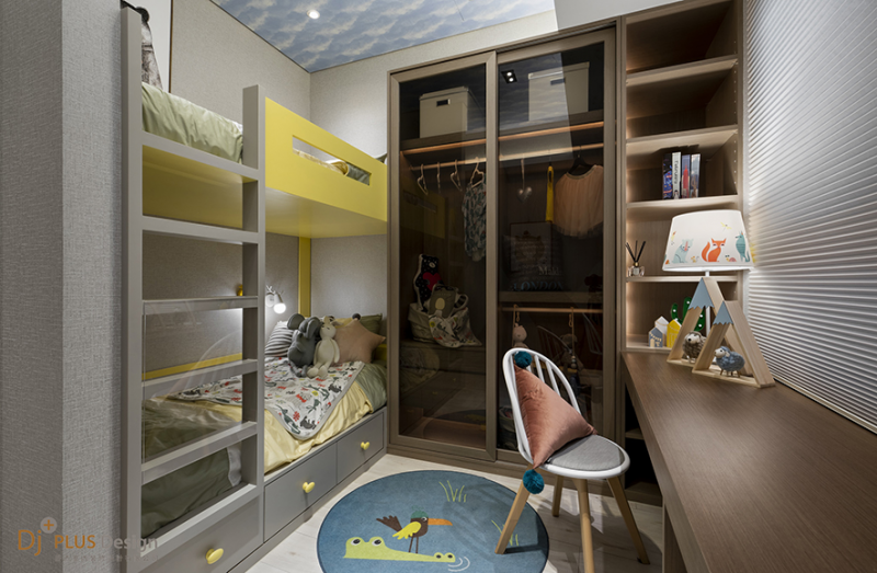 小孩房以趣味一詞揭開序曲,以充滿童心的亮黃色作為主軸,搭配蜜橙色的三角型抱枕,整體色彩張弛有度盡顯於童心之房,而木色的上下床層櫃也讓機能收納達到變化多端的空間層次。