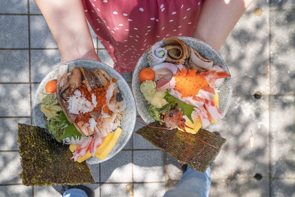 這一碗就有鮭魚、鮪魚、紅紺、天使紅蝦…等數數就快10種食材層層堆疊,看了就超過癮!一點芥末、醬油襯托出各式食材新鮮原味,在搭配底層酸甜醋飯,絕對既飽足又滿足的!