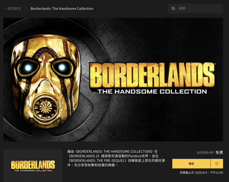 現在進到Epic Games Store網站後,就可以看到免費遊戲下的《邊緣禁地:帥氣合輯(Borderlands: The Handsome Collection)》,限免時間到 2020年6月5日上午12:00截止。