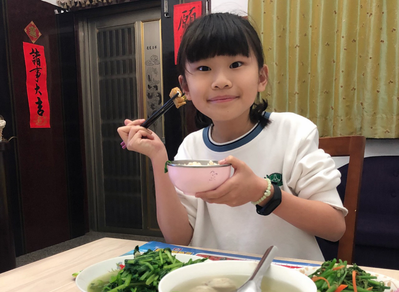 (慈濟附小五年級的范庭婕,外號「小玫瑰」藉由影片,推廣蔬食飲食,介紹自家平時的晚餐料理,不止說了一口好菜。)