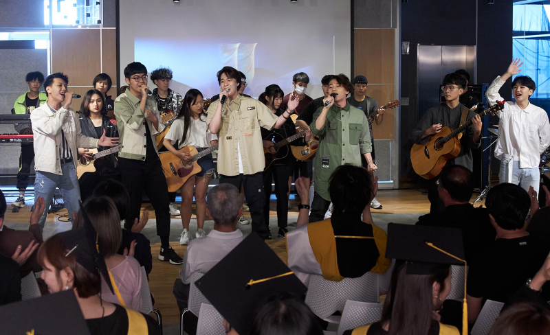 今流行音樂系在校生一手包辦三段式Live Band歌舞表演,其中,改編經典名曲《快樂天堂》為Rap版,當年參與演唱的小玲老師,還在學生即興邀請之下,接下麥克風演唱了自己演唱的歌詞部分,博得滿堂彩,讓所有師生都驚喜尖叫不己,隨後在全體畢業生同時飛拋學士帽時,完成難忘的首屆畢業典禮!